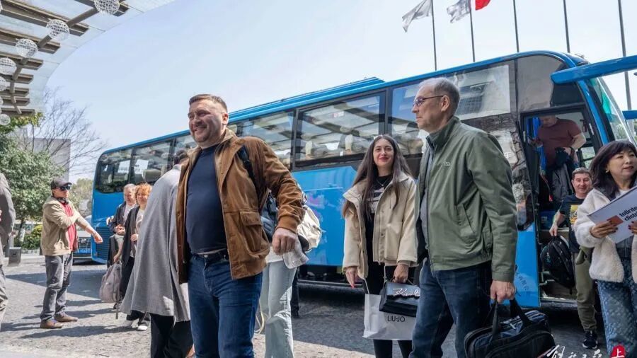 昨天11:40许,两辆载着61名俄罗斯游客的蓝色大巴先后驶抵上海中心J酒店。游客们一下车,便收到了地接旅行社、酒店工作人员的热情迎接:“Welcome to Shanghai!(欢迎来上海)”